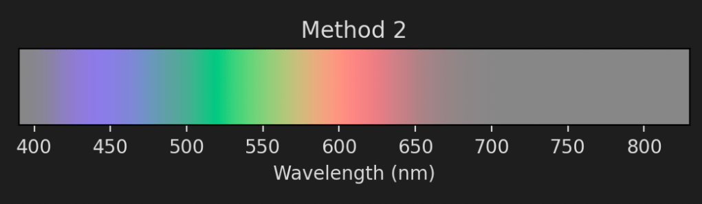 This spectrum looks much smoother but is also more washed out. For the next blog posts this won’t matter too much since I’m not going to be displaying a lot of monochromatic light. We’ll therefore sit comfortably within the range of colours that screens can display.