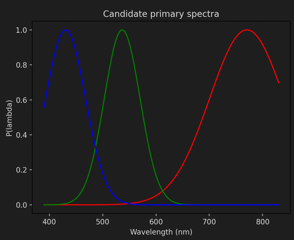 If we want to create sRGB values from these cone fundamentals we will need to know the power spectrum of the primaries. Unfortunately, no such thing exists, since the standard is defined in terms of xy values4. However, all hope is not lost. If we can find a power spectrum that gives the same xy value as the primary we can use this. Given that there are an infinite number of spectra that will produce the same xy values that shouldn’t be too hard. Let’s parameterise a simple model based on a normal distribution: