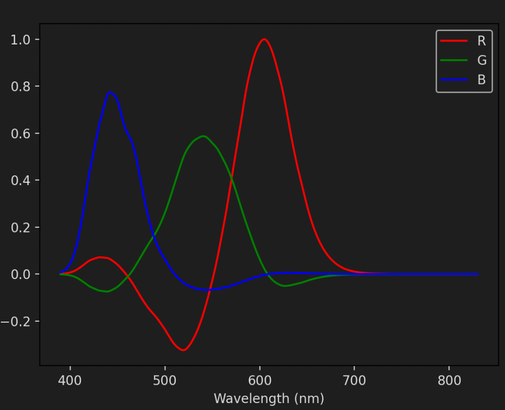 When they couldn’t match a target exactly, observers were asked to add light to the target instead. Using Grassmann’s third law (Which is just linearity with extra steps) we can then infer what light we would have had to add to match the original target. We simply subtract the light that was added to the target from both halves of the disk. In this sense we can end up with a negative amount of a primary colour.